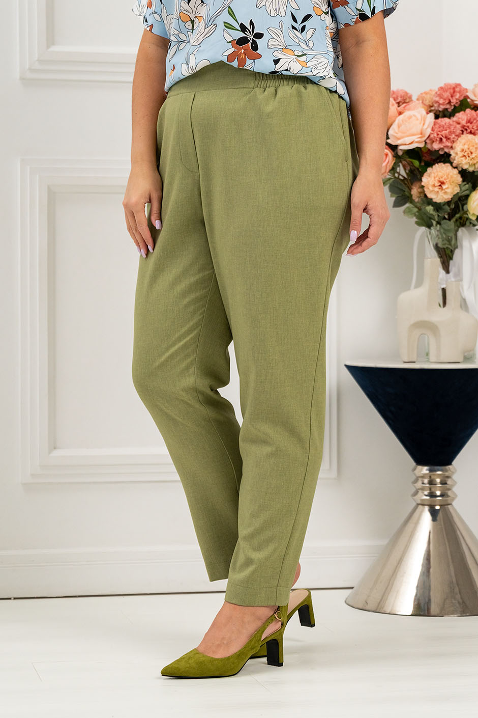 Ткань: смесовый лен. Брюки с высокой посадкой, спереди – пояс кокетка, сзади на резине, в боковых швах – косые карманы. Длина по внутреннему шву ок. 72 см