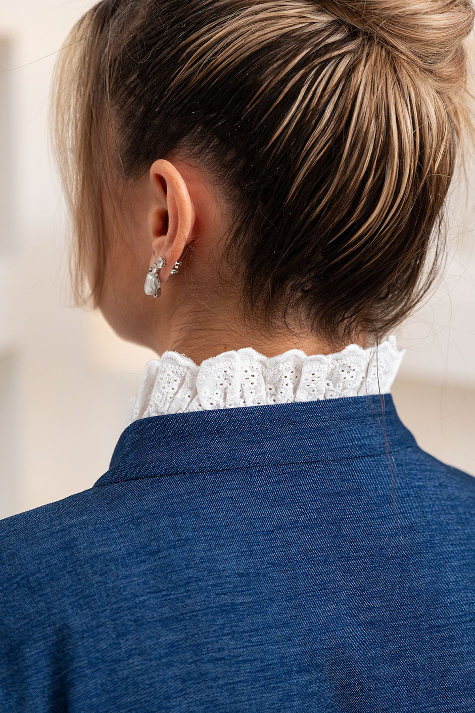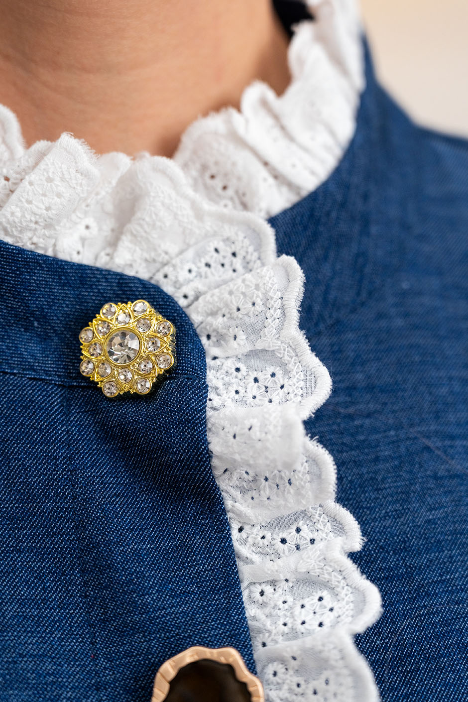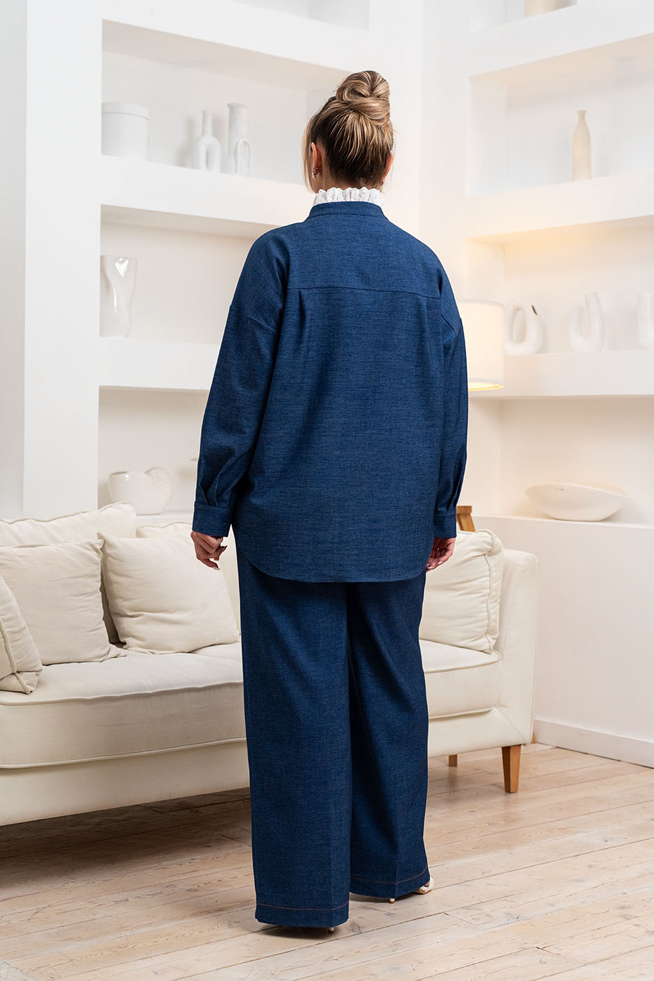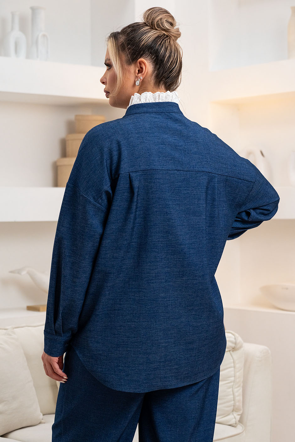 Ткань: джинсовая. Рубашка свободного покроя, линия плеча немного занижена,отделка шитьем по горловине и части полочки, застежка декорирована пуговицами-брошами, в стиле скиапарелли. Низ изделия закруглен. Рукав длинный, на манжете. Длина изд.ок.73см.